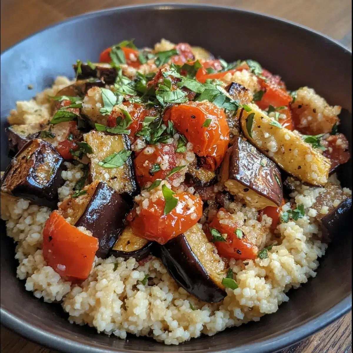 I was standing in my kitchen, staring at a stubborn, unripe eggplant that looked like a lump of charcoal, when my friend dared me to turn it into something spectacular. The challenge was simple: roast the eggplant until it was tender and caramelized, then marry it with bright cherry tomatoes and a fluffy couscous base. I thought, “Why not?” The moment the oven timer chimed, the kitchen filled with a smoky, almost sweet scent that made my mouth water.