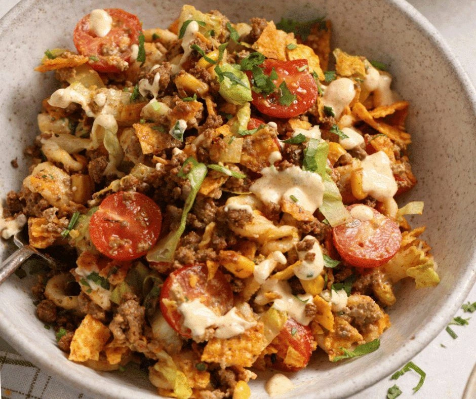 - Combine everything. In a large mixing bowl, combine the cooled pasta, seasoned beef, corn, tomatoes, and the dressing. Toss gently to ensure every component is evenly coated. The sauce should cling to the pasta like a velvet blanket, yet still allow the crunch of the Doritos to shine through.